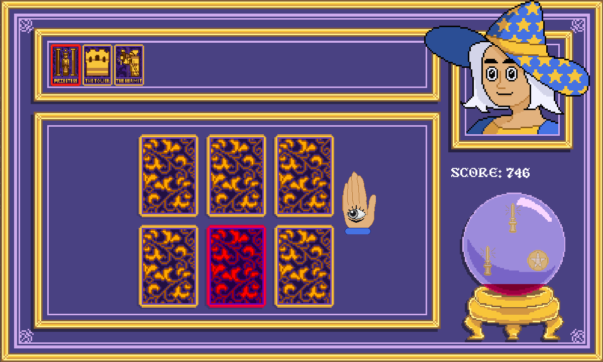 Twist on a classic memory game, you’re trying to match the minor tarot cards on the field with the ones on your crystal ball, but new major tarot cards come in each round to help or hurt you. Completed in a 72-hour jam, solo programmer and co-designer.